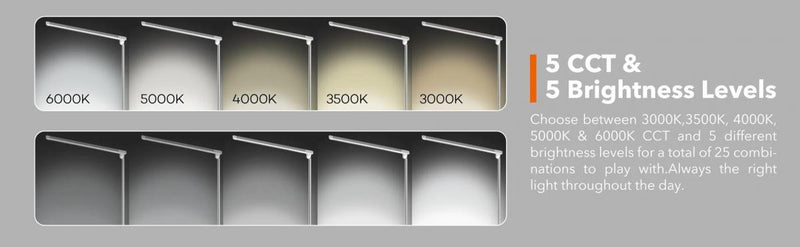 - 25 lighting modes for any occasion: Choose between 3000K, 3500K, 4000K, 5000K and 6000K CCT, each with 5 different brightness levels. Browse a total of 25 possible combinations to get the perfect light pattern for any occasion