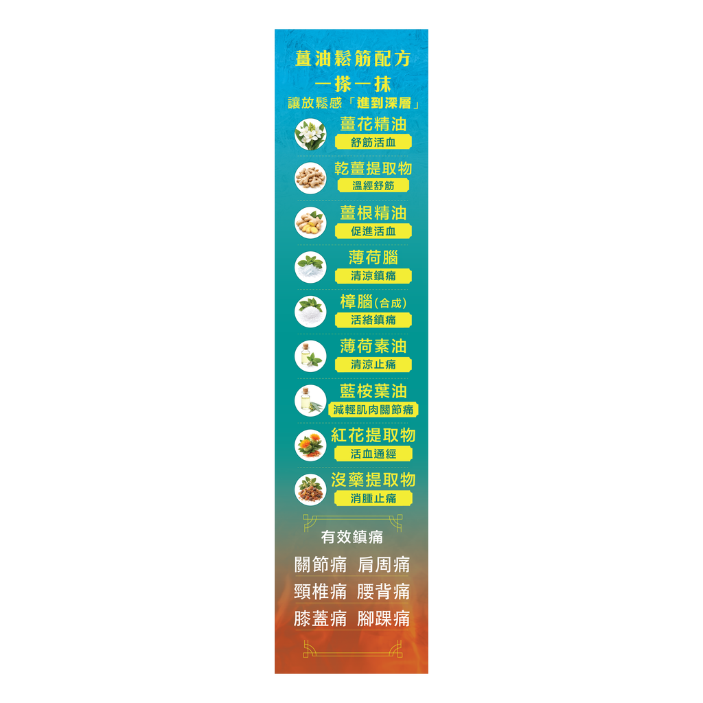 將本品塗抹於肩頸、腰背、膝關節、手腳穴位等不適部位,冷感瞬間舒緩緊繃,熱感隨後釋放活力,達致通經活絡、驅寒鎮痛效果。