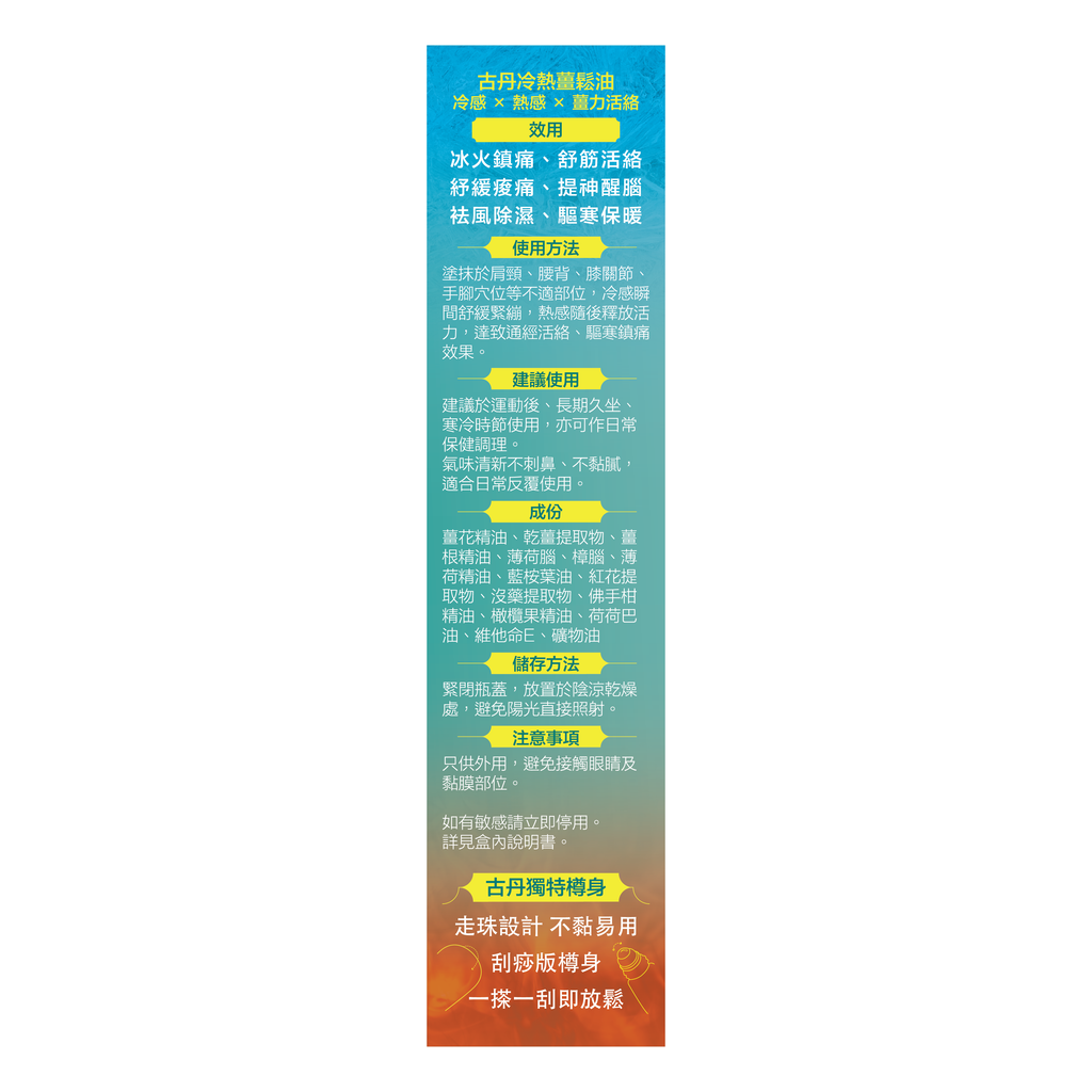 G&D 古丹冷熱薑鬆油成份天然,氣味清新,融合薄荷與薑的雙重草本精華,帶來先清涼、後溫熱的舒暢感受,有效提神醒腦、放鬆肌肉。適用於肩頸、腰背、關節及蚊蟲叮咬部位,清新不刺鼻、不黏膩,日常保健與運動後舒緩皆宜。香港製造,隨時隨地為身體注入活力。